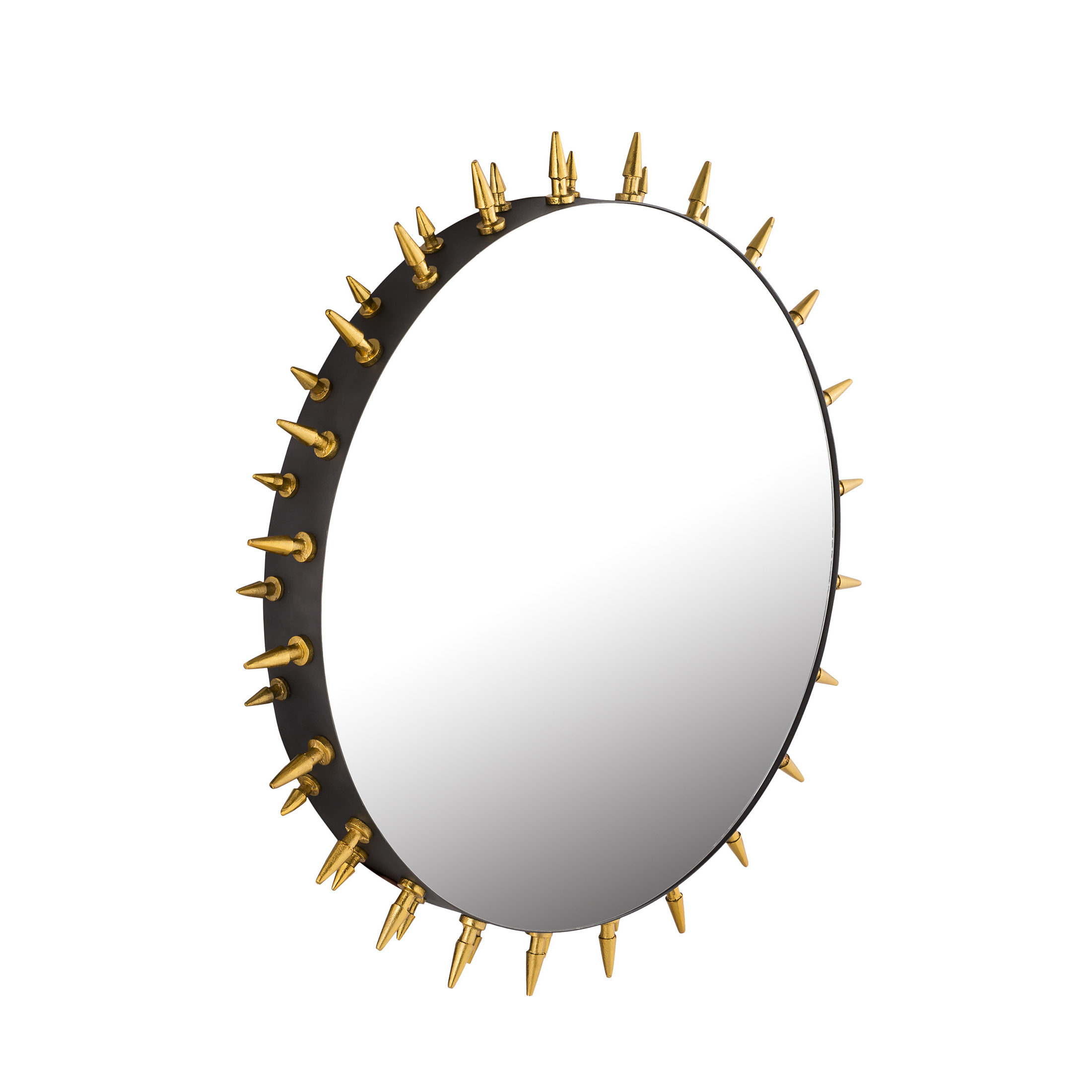 If you want to place an eye-catching home accessory on the wall of your room, then our ABSRACT wall mirror is just the thing. The large, round mirror has a narrow black metal frame. The extraordinary thing about it are the numerous golden rivets, which are radiated in different sizes on the outer edge.