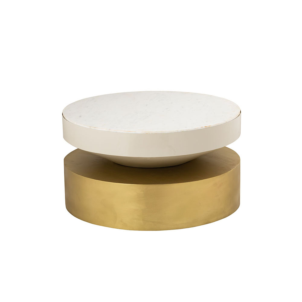 White table with an abstract cone shaped top, accentuated with a matte gold metal top.