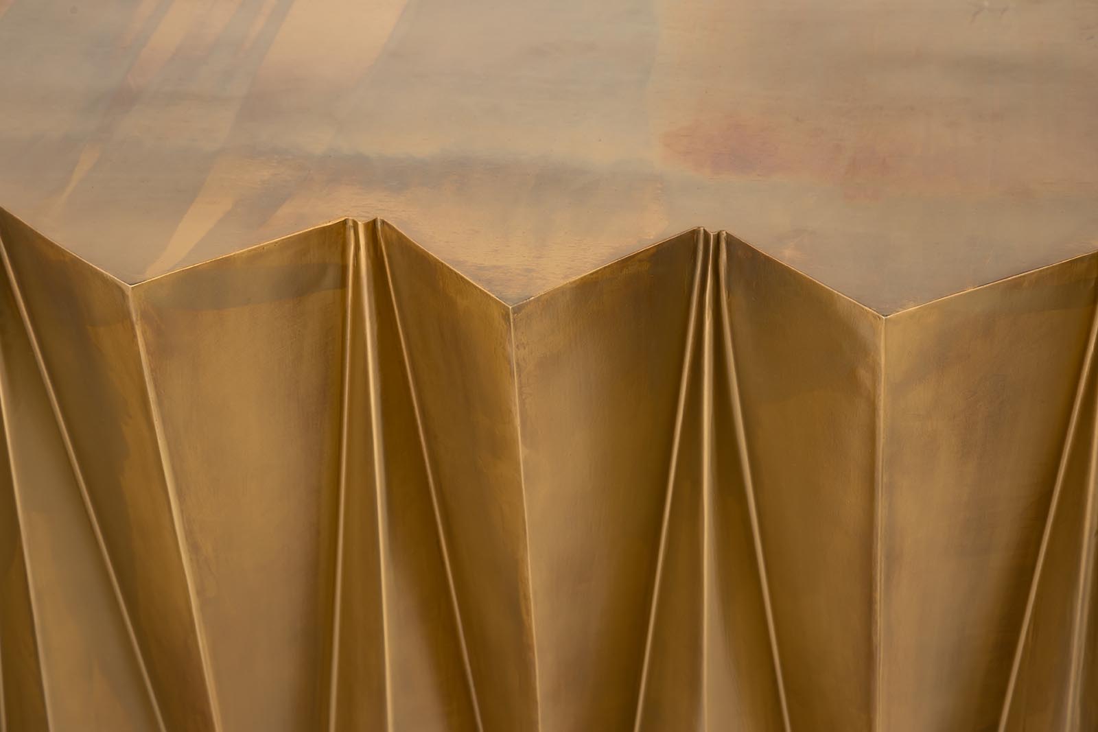 This contemporary console makes a monumental statement in any space. Inspired by the form and style of modernism s Brutalist designers, its gold finish and substantial presence makes this a top selection by interior decorators.