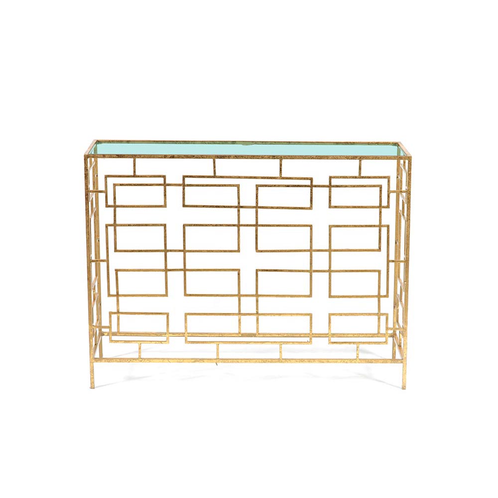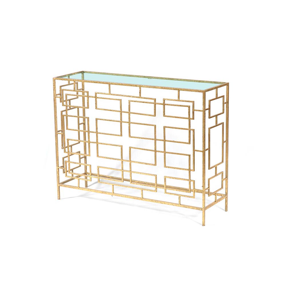Captivate your guests with this metallic gold maze console table along with velvet upholstered chairs and a large gold vase or sculpture for a luxurious upgrade. Designed with black rubber stoppers at the base that prevents scratching of floors and surfaces. This item ships in 1 carton. Suitable for indoor use only. Large gold console table has a 100 lbs weight limit. Made in India. Contemporary style.